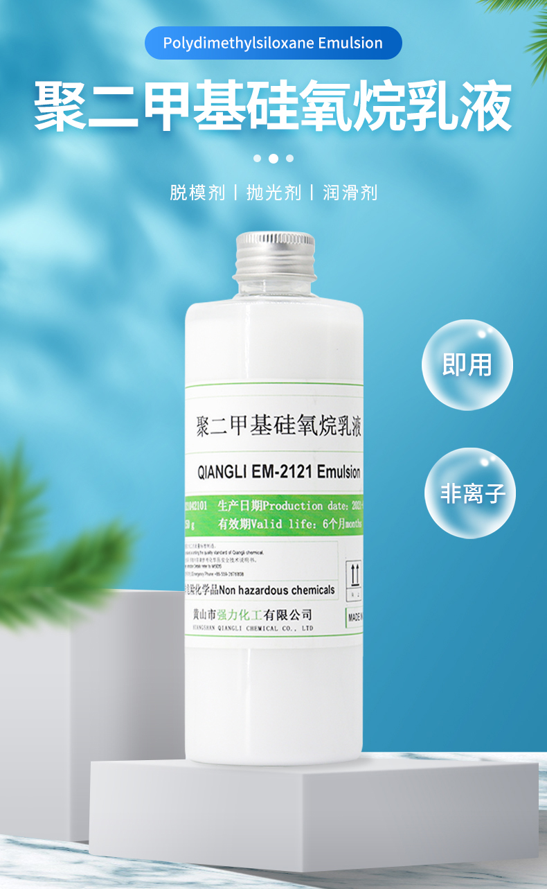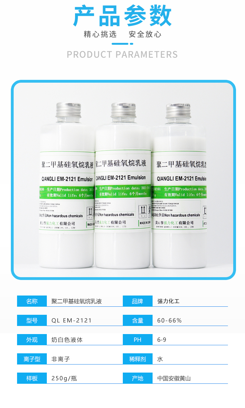 QIANGLI EM-2121 Emulsion是活性含量為60%的非離子聚二甲基硅氧烷乳液,因?yàn)槠浞请x子性,它可廣泛用于各種體系,如非離子,陰離子,陽離子乳化體系或不形成復(fù)合體的聚合物體系,