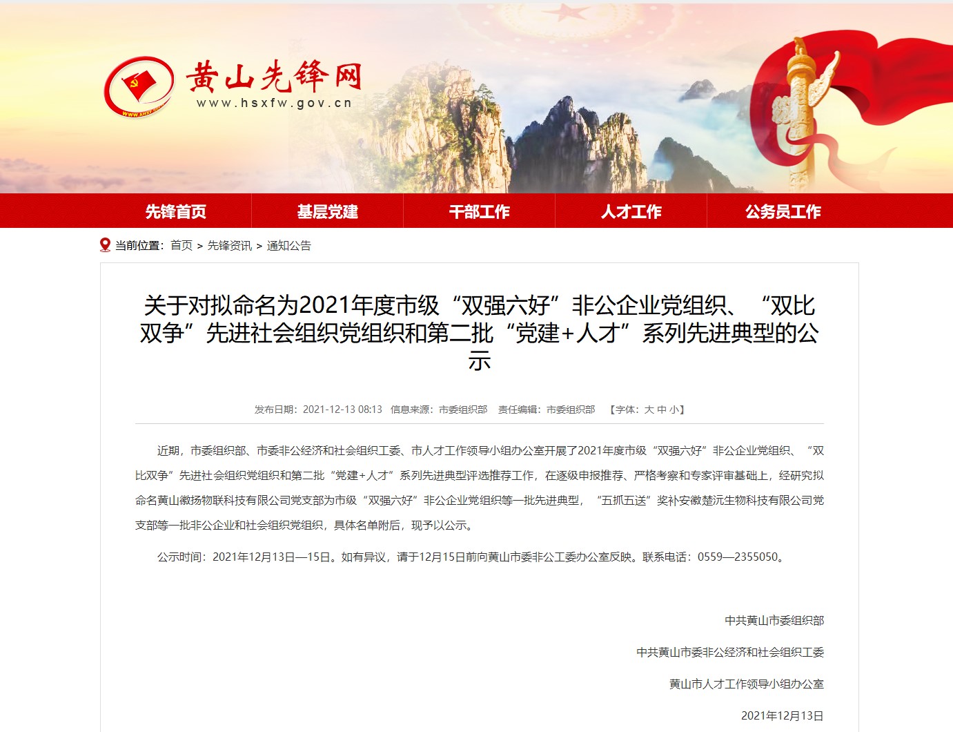 近期,黃山市市委組織部、市委非公經(jīng)濟和社會組織工委、市人才工作領導小組辦公室開展了2021年度市級“雙強六好”非公企業(yè)黨組織、“雙比雙爭”先進社會組織黨組織和第二批“黨建+人才”系列先進典型評選推薦工作,在逐級申報推薦、嚴格考察和專家評審基礎上進行評判。以“五亮工程”為載體,通過“亮”身份樹立黨員形象、“亮”責任促進黨員工作、“亮”承諾凝聚共同愿景、“亮”業(yè)績體現(xiàn)黨員先進、“亮”旗幟彰顯標桿引領,充分促進黨建與中心工作有機結(jié)合,將黨建質(zhì)量提升落到實處。我司董京星同志獲得黃山市市級“五亮”先鋒典型,強力化工全體同仁必將以之為楷模,不斷學習不斷提升,更好的投入工作服務社會!