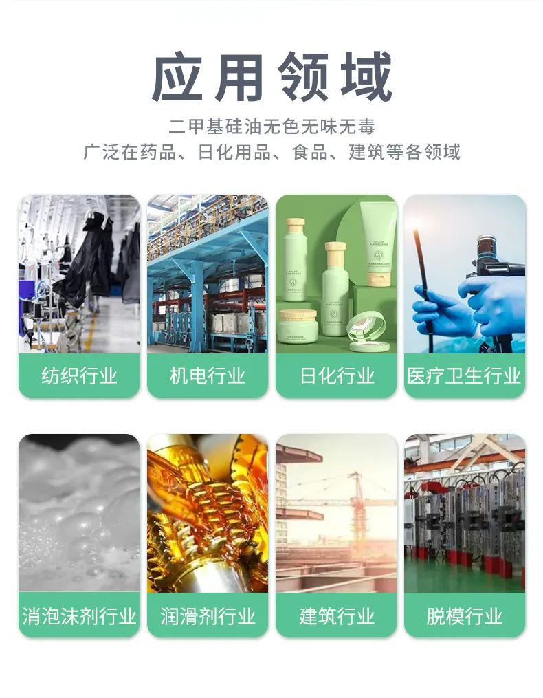 二甲基硅油廣泛用在電機(jī)、電器、電子儀表上作為耐溫、耐電弧電暈、抗蝕、防潮、防塵的絕緣介質(zhì)、目前還用做變壓器、電容器、電視機(jī)的掃描變壓器的浸漬劑等。在各種精密機(jī)械、儀器及儀表中,用作液體防震、阻尼材料。二甲基硅油的消震性能受溫度影響小,多用于具有強(qiáng)烈機(jī)械震動(dòng)及環(huán)境溫度變化大的場合下,使用的儀表如:飛機(jī)、汽車的儀表中。用于防震、阻尼、穩(wěn)定儀表讀數(shù),還可作為液體彈簧,且于飛機(jī)的著陸裝置中。