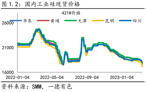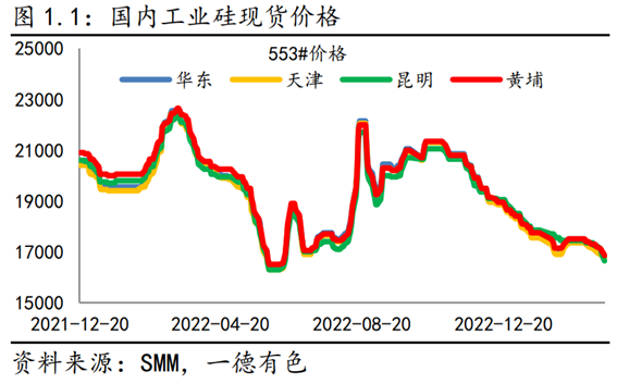 2022年12月22日工業(yè)硅商品期貨成功上市,在春節(jié)前消費疲軟的基本面情況下上市前兩個交易日內(nèi)工業(yè)硅現(xiàn)貨價格從19700元/噸下跌至17000元/噸,但現(xiàn)貨市場表現(xiàn)平穩(wěn)回落報價并未跟隨期貨價格波動,期貨價格宣泄情緒后開始反彈。但新進(jìn)期現(xiàn)貿(mào)易商的參與打破了原有工業(yè)硅行業(yè)的貿(mào)易模式及現(xiàn)貨市場供需格局,春節(jié)后新進(jìn)貿(mào)易商現(xiàn)貨市場積極采購緩解了廠家的銷售壓力,現(xiàn)貨市場出現(xiàn)為期一周短暫的反彈。但終端實際消費除了多晶硅需求平穩(wěn)外,有機(jī)硅及鋁合金仍處于放假期間采購積極性不高,尤其有機(jī)硅行業(yè)依舊面臨全行業(yè)虧損的情況,復(fù)產(chǎn)復(fù)工積極性不高。在弱消費顯示的情況下,期現(xiàn)貨價格同步下滑,且由于期現(xiàn)貿(mào)易商的拋售使得價格出現(xiàn)了踩踏行為,3月底期貨價格跌破16000元/噸,跌破部分企業(yè)生產(chǎn)現(xiàn)金流成本,南方地區(qū)工廠出現(xiàn)新一輪的減產(chǎn)行為,且復(fù)產(chǎn)計劃頻頻推遲。西南供給端收縮明顯,但西北新增產(chǎn)能投放如常,造成一季度全國產(chǎn)量大幅度走高,對市場價格形成壓力。