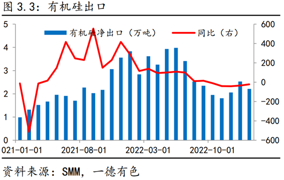 1-2月份有機(jī)硅凈出口4.74萬噸,同比下滑29%,凈出口量自2022年下半年開始下滑也與海外消費衰退相吻合,且目前了解傳統(tǒng)消費旺季出口依舊疲軟,預(yù)計2023年有機(jī)硅凈出口量30萬噸左右,同比減少17%。