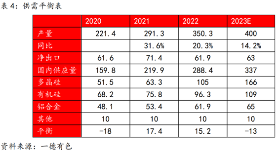2023年預(yù)計工業(yè)硅產(chǎn)量400萬噸,同比增長14.2%左右,2023年工業(yè)硅凈出口預(yù)估63萬噸,多晶硅消費大幅度提升至166萬噸,有機(jī)硅行業(yè)預(yù)估消費量109萬噸,全年國內(nèi)消費350萬噸,增速28%,全年緊缺13萬噸,不過由于多晶硅產(chǎn)量釋放周期長,因此預(yù)計2023年上半年工業(yè)硅仍將面臨壓力。