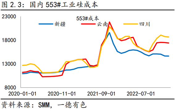 總所周知一季度受價格下跌和成本壓力,西南地區(qū)出現(xiàn)規(guī)模性減產(chǎn)甚至停機(jī)檢修,且復(fù)產(chǎn)計劃均有推遲,供應(yīng)端呈現(xiàn)北增南減的局面,因此在豐水季來臨前即電價下調(diào)前,工業(yè)硅期貨盤面可依托現(xiàn)金流成本價格逢低布局多單,但上漲缺乏動力預(yù)計空間不大。2023年預(yù)計工業(yè)硅產(chǎn)量400萬噸,同比增長14.2%左右,2023年工業(yè)硅凈出口預(yù)估63萬噸,多晶硅消費大幅度提升至166萬噸,有機(jī)硅行業(yè)預(yù)估消費量109萬噸,全年國內(nèi)消費350萬噸,增速28%,全年緊缺13萬噸,不過由于多晶硅產(chǎn)量釋放周期長,因此預(yù)計2023年上半年工業(yè)硅仍將面臨壓力。