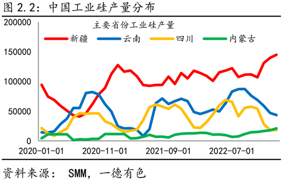 據(jù)SMM數(shù)據(jù)統(tǒng)計2023年1-2月份中國工業(yè)硅產(chǎn)量55.48萬噸(不包含97硅和再生硅),累計同比增長13.7%,2月份在生產(chǎn)周期僅為28天的情況下產(chǎn)量依舊環(huán)比增長2.6%。從分區(qū)域數(shù)據(jù)來看,產(chǎn)量貢獻(xiàn)來源于新疆和內(nèi)蒙地區(qū),1-2月份新疆地區(qū)產(chǎn)量28.47萬噸,累計同比增長22.5%,內(nèi)蒙地區(qū)產(chǎn)量3.87萬噸,累計同比增長47.7萬噸,內(nèi)蒙地區(qū)主要源于鑫元硅材的產(chǎn)量貢獻(xiàn)。