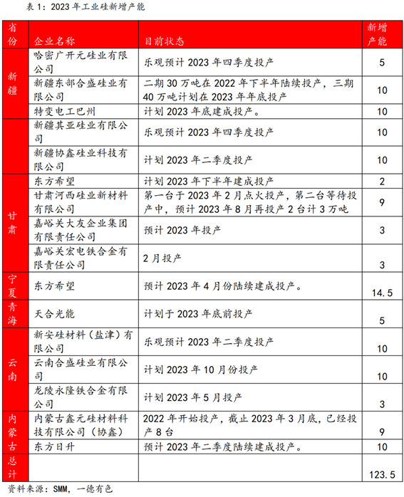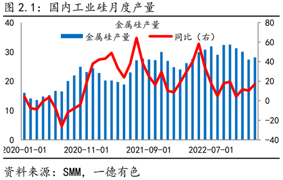 2023年1-2月份中國工業(yè)硅產(chǎn)量55.48萬噸(不包含97硅和再生硅),累計同比增長13.7%,預(yù)計3月份國內(nèi)工業(yè)硅產(chǎn)量30-31萬噸,4月產(chǎn)量約29萬噸,日均產(chǎn)量較2月份減少5%。2023年新增產(chǎn)能或達(dá)到123.5萬噸,全年預(yù)計產(chǎn)量400萬噸,同比增長14.2%。