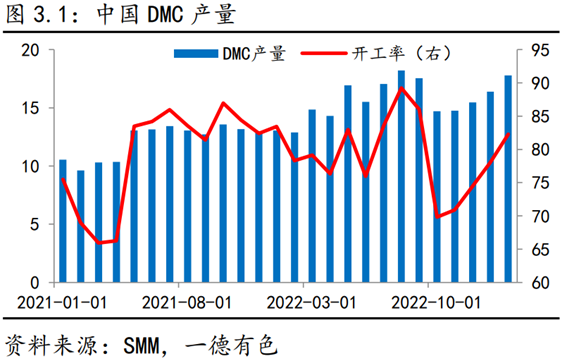 據(jù)統(tǒng)計2023年1-2月份中國DMC產(chǎn)量34.18萬噸,累計同比增長31.8%,2022年底由于下游消費疲軟,有機(jī)硅企業(yè)進(jìn)行主動的檢修減產(chǎn),開工率及產(chǎn)量均出現(xiàn)了明顯的下滑。2023年春節(jié)后,隨著疫情的放開市場情緒的好轉(zhuǎn),終端消費復(fù)蘇有機(jī)硅行業(yè)成本庫存壓力減小,價格有所回升,但漲勢并未持續(xù),小企業(yè)受迫于生存壓力出現(xiàn)降價賣貨的情況。行業(yè)洗牌依舊持續(xù),新疆合盛持續(xù)投產(chǎn),個別小企業(yè)負(fù)荷仍在降低,不過市場整體貨源供應(yīng)持續(xù)增加。