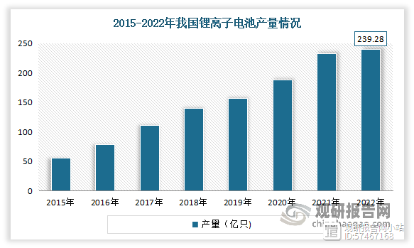 鋰離子電池產(chǎn)業(yè)是我國(guó)重點(diǎn)發(fā)展的新能源、新能源汽車和新材料三大產(chǎn)業(yè)中的交叉產(chǎn)業(yè),近年國(guó)家出臺(tái)了一系列支持鋰離子電池產(chǎn)業(yè)的支持政策,直接帶動(dòng)中國(guó)鋰離子電池市場(chǎng)高速增長(zhǎng)。與此同時(shí),隨著3C數(shù)碼產(chǎn)品、智能穿戴產(chǎn)品對(duì)鋰離子電池需求量的穩(wěn)定增加,以及新能源汽車的市場(chǎng)規(guī)模逐步擴(kuò)大和儲(chǔ)能電池的需求擴(kuò)大,也帶動(dòng)我國(guó)鋰離子電池產(chǎn)量規(guī)模逐年擴(kuò)大。2015-2022年我國(guó)鋰離子電池的產(chǎn)量不斷增長(zhǎng)。數(shù)據(jù)顯示,2022年我國(guó)鋰離子電池產(chǎn)量239.28億只,同比增長(zhǎng)2.85%。