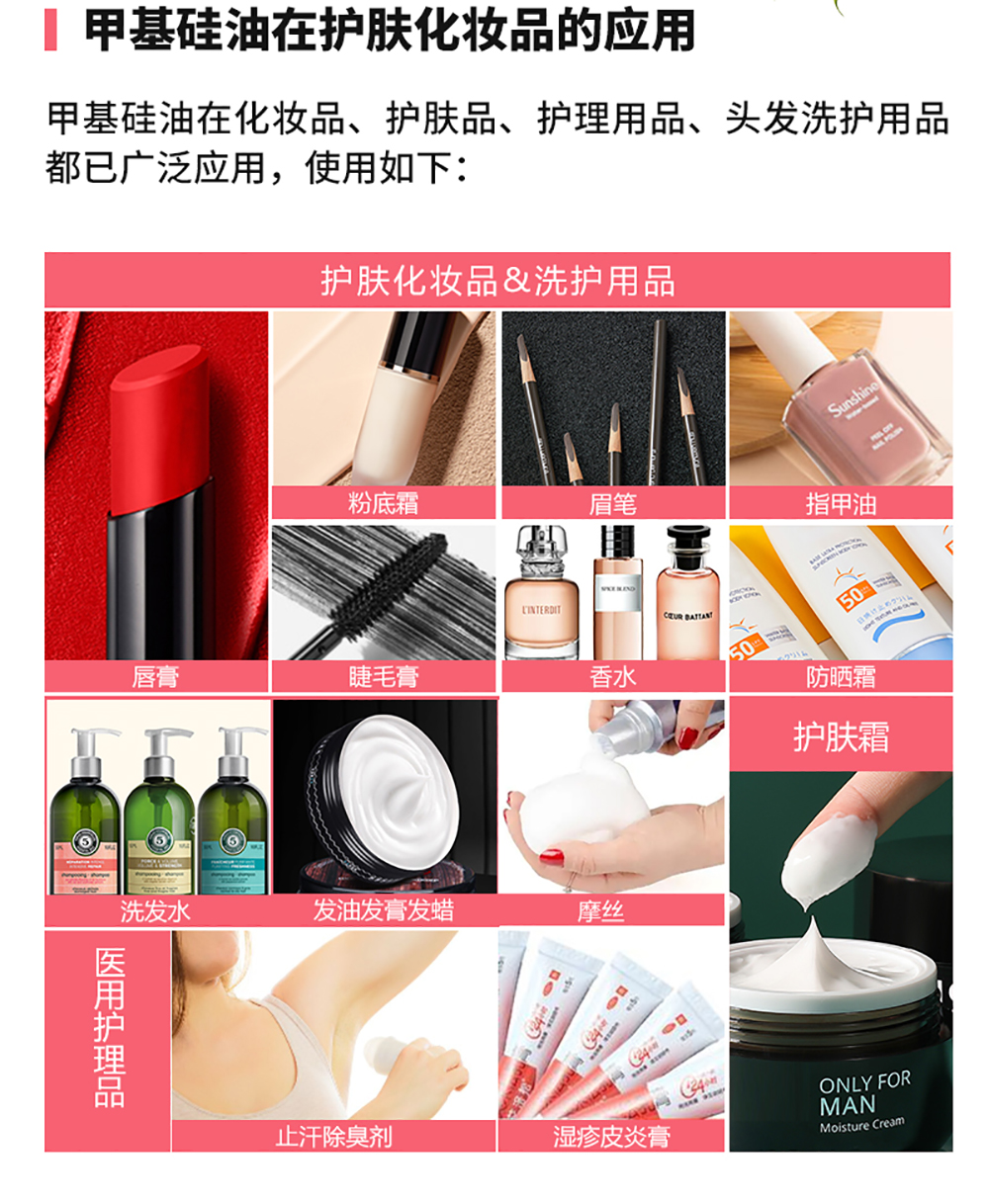 聚二甲基硅氧烷可用作潤滑劑、脫模劑、消泡劑、柔軟劑、防震劑、絕緣劑、光亮劑、填縫劑、防潮劑、介電液等,被廣泛應(yīng)用在醫(yī)療、食品、日化、家具、建材、紡織皮革、塑料橡膠、電子電氣、汽車等行業(yè)中。